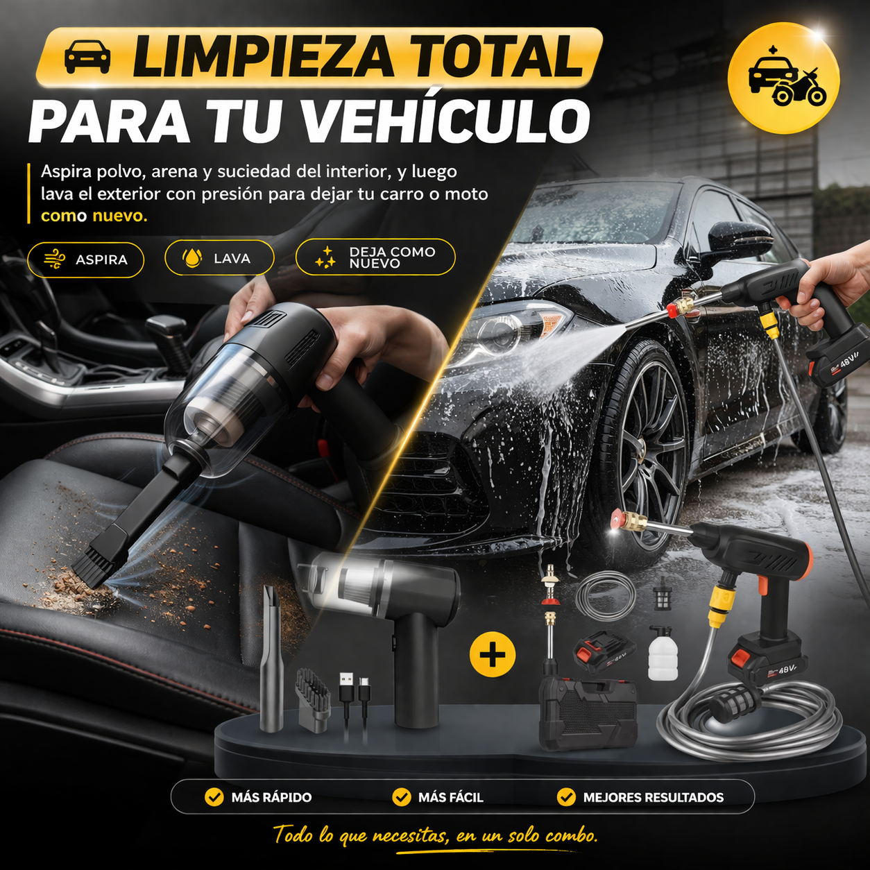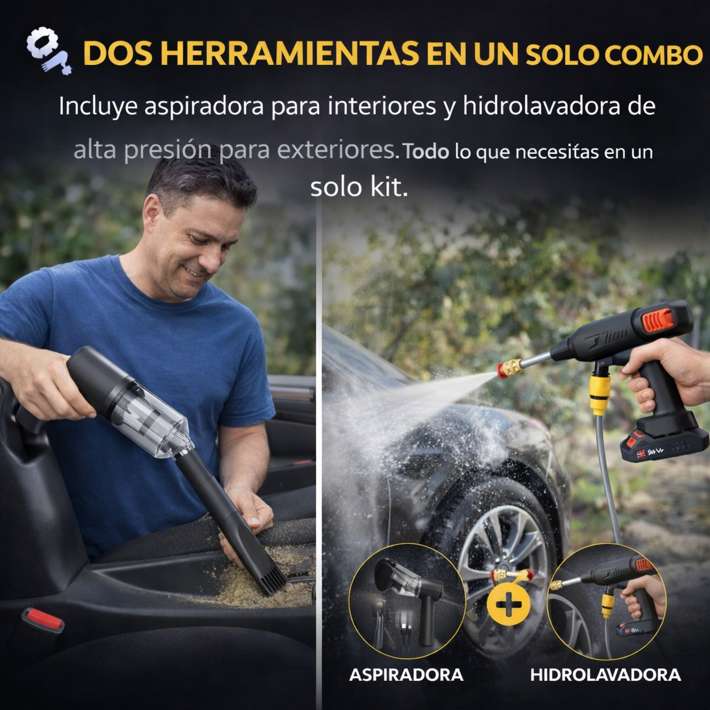 Incluye aspiradora para interiores y hidrolavadora de alta presión para exteriores. Todo lo que necesitas en un solo kit.