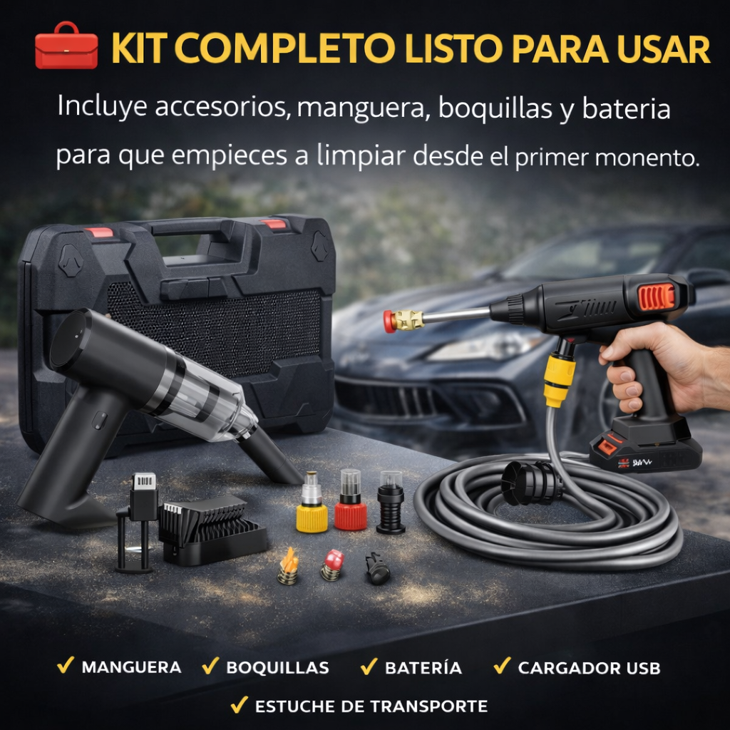 🧰 KIT COMPLETO TODO EN UNOIncluye aspiradora, hidrolavadora y accesorios para limpiar interior y exterior fácilmente.